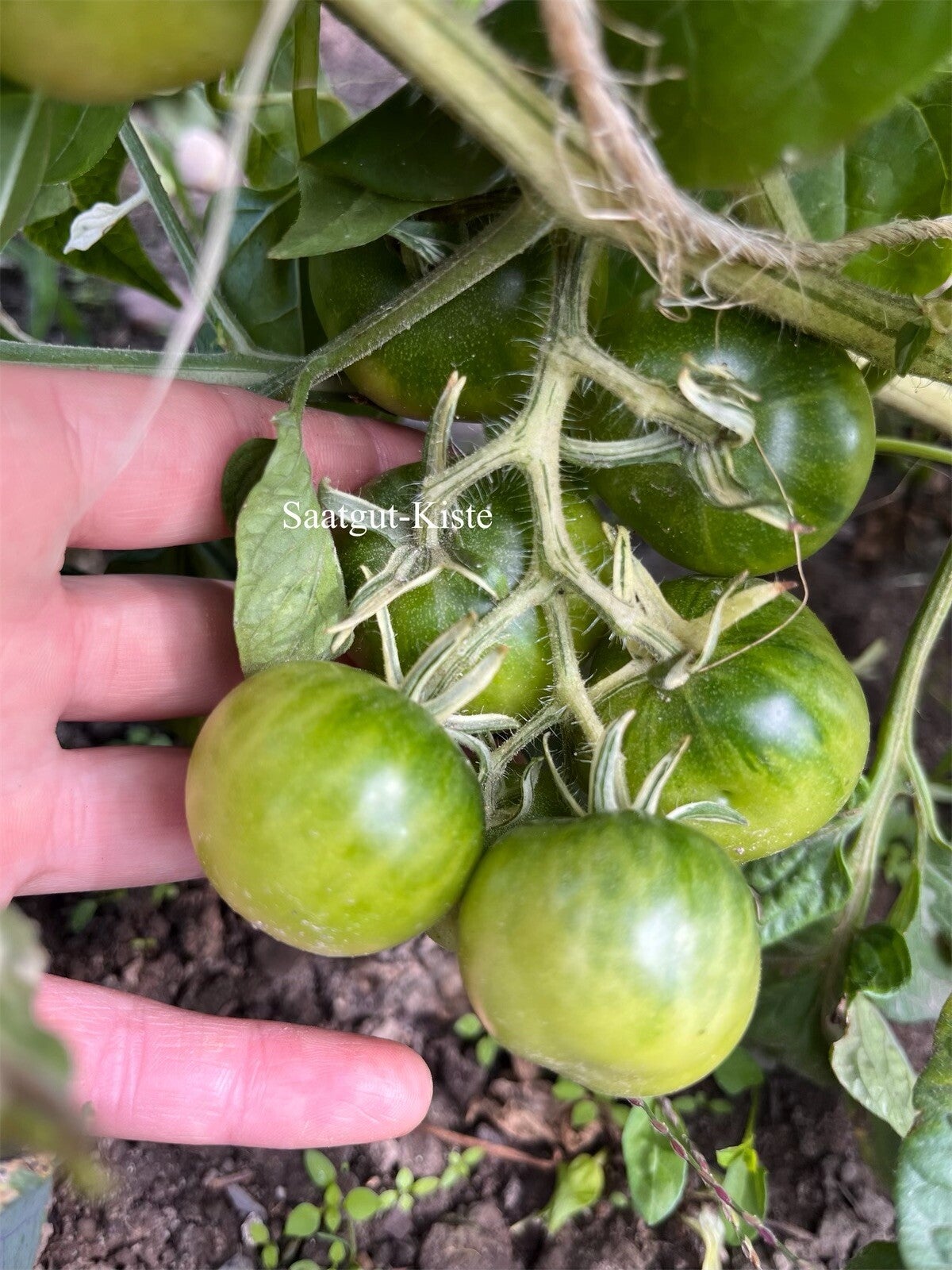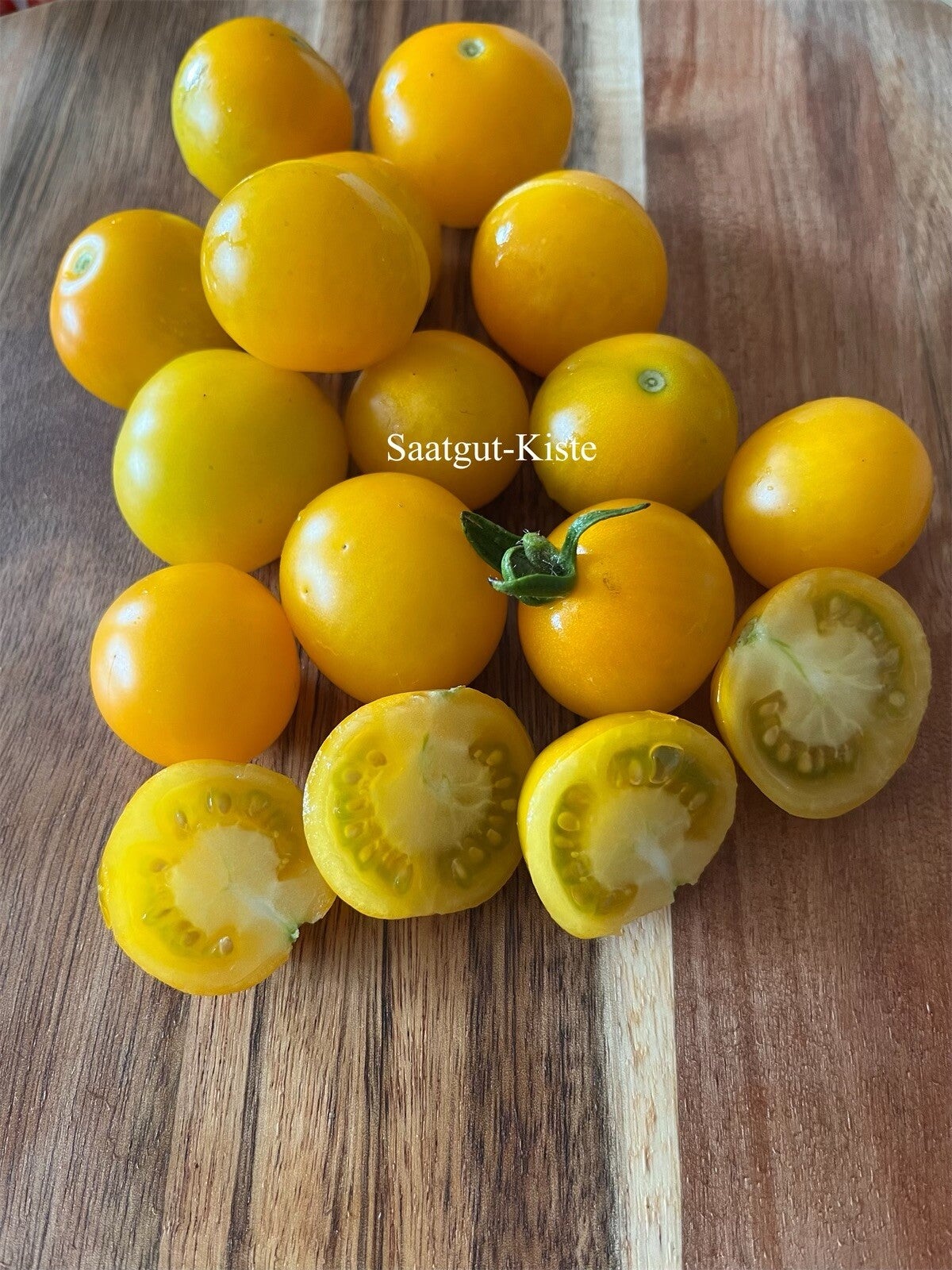 Diese Sorte ist mittelfrühreif und erreicht eine Wuchshöhe von ca. 1,50 Meter mit schön panaschiertem Laub. Die orangegelben Früchte haben einen süßlich-tomatigen Geschmack. Das Fruchtgewicht liegt zwischen 30-50 Gramm.