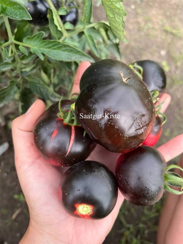 Bandol Blues ist eine tolle und reichtragende Sorte. Die farbenfrohen Tomaten haben ein Fruchtgewicht von 60-130 Gramm, welches ein sehr süßen Geschmack hat. Die Wuchshöhe kann bis zu 2,50 Meter betragen. Es ist dunkelste Sorte, die ich bisher gesehen habe.
