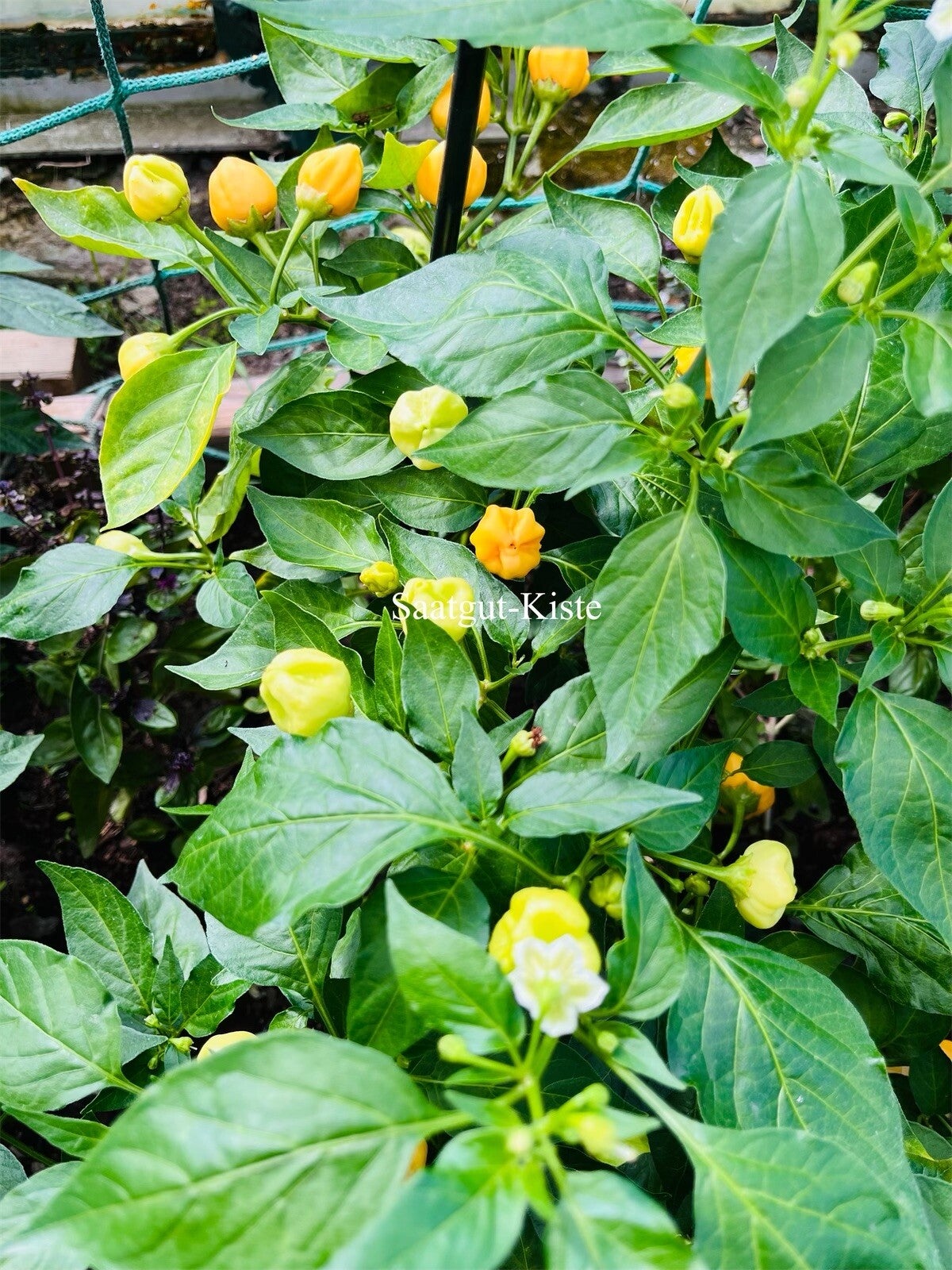 Apricot Apple erreicht eine Wuchshöhe von ca. 80 cm und hat einen wunderbaren Ertrag. Die pfirsichfarbenen Früchte haben eine angenehme Schärfe und einen süß-fruchtigen Geschmack. Aufgrund der milden Schärfe kann man diese auch in großen Mengen verarbeiten, ohne das es zu scharf wird. Die Chilis sind auch super zum trocknen für Saucen und Chutneys.