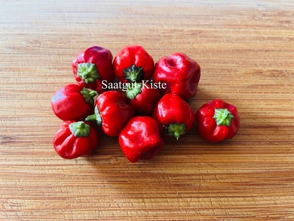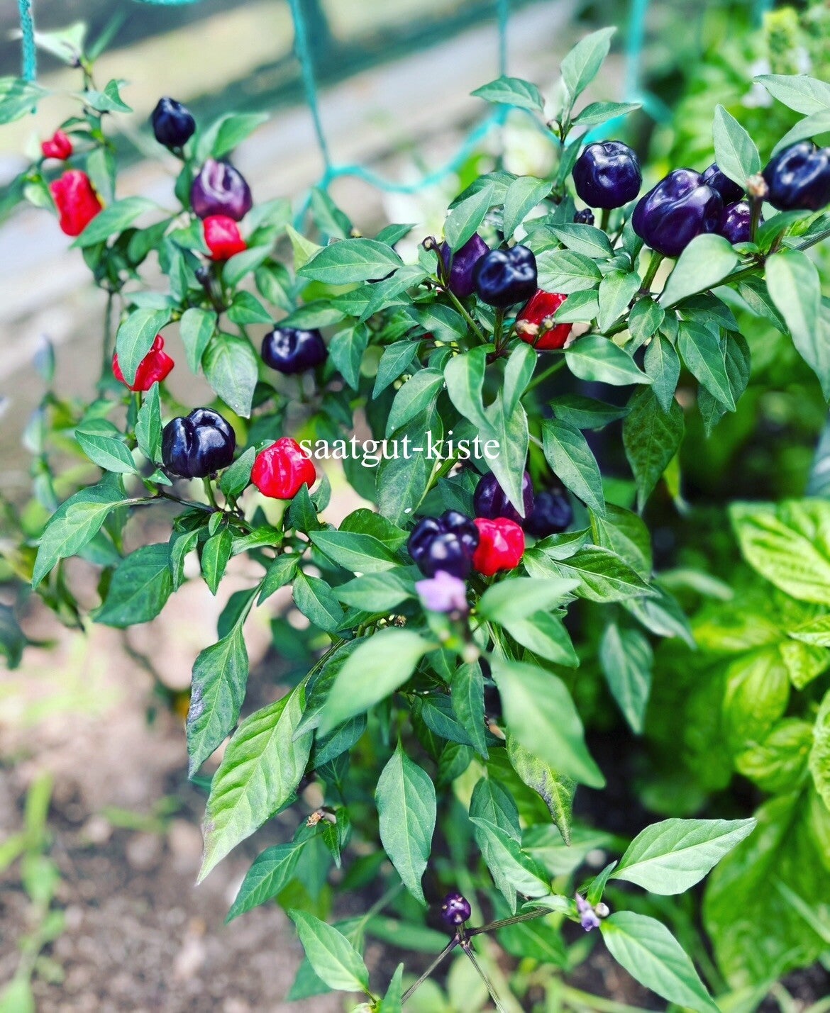 Purple Pumpkin ist wirklich wunderschön. Die kleinen Chilis sehen wie Minikürbisse aus. Sie reifen von lila, gelb über orange nach rot ab. Die Früchte sind knackig und besitzen einen kleinen Anteil von Süße. Die Wuchshöhe beträgt 50-80 cm und kann somit auch in einem Kübel kultiviert werden.