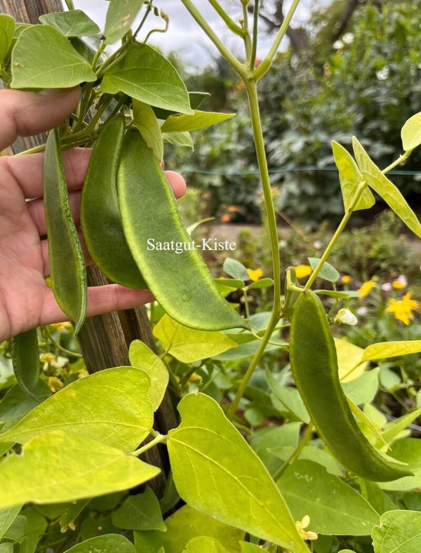 Christmas Lima ist auch bekannt unter Mondbohne. Hier werden die reifen Kerne gekocht, die nur so zum Verzehr geeignet sind. Super machen diese sich in Eintöpfen wie z. B. Chili con Carne. Die Wuchshöhe liegt bei ca 2 Meter. Die Sorte trägt ab September die ersten reifen trockenen Schoten.