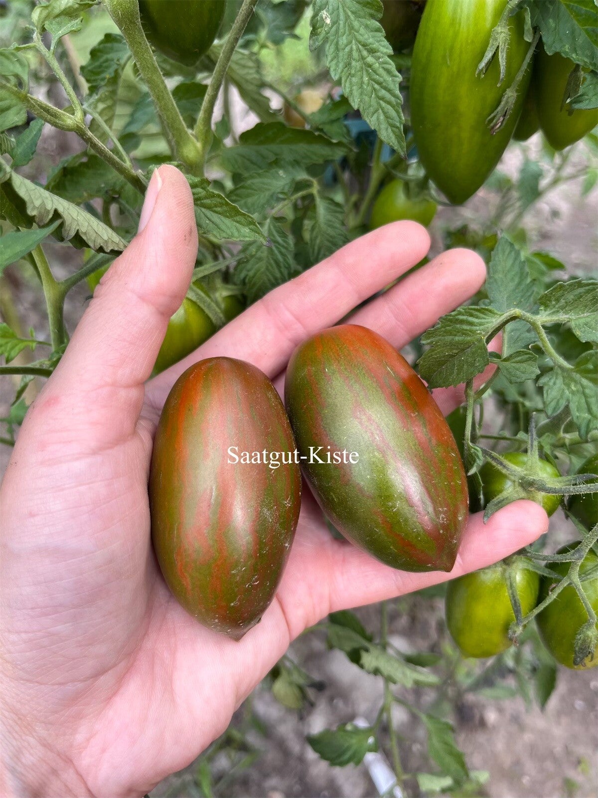 Märchenmonster erreicht eine Wuchshöhe bis zu 1,90 Meter. Die ovalen Früchte mit leichter Spitze besitzen einen würzig-süßlichen Geschmack. Die Tomaten haben ein Gewicht von 50-70 Gramm mit einer festen Schale, wodurch diese länger haltbar sind.
