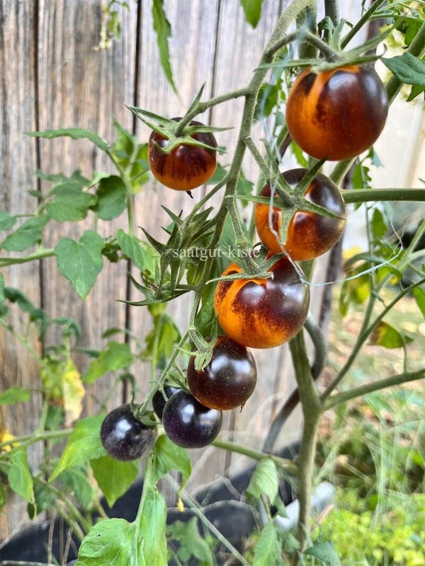 Hälfte dunkelviolett, fast schwarz sind. Das Fruchtgewicht liegt bei ca. 20-30 g. Das leuchtend orange