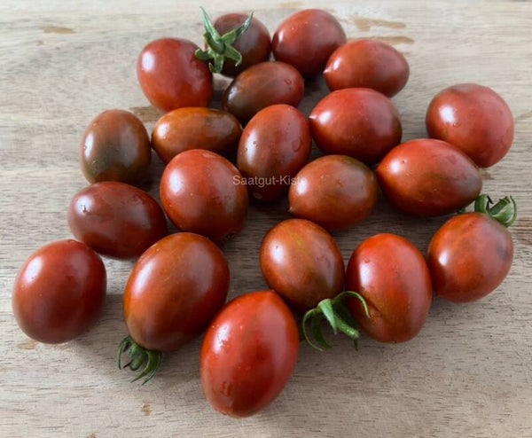 Sie ist frühreif und reichtragend. Die kleinen mahagonifarbenen spitz zulaufenden Tomaten haben ein Gewicht von ca. 20 g. Das Fruchtfleisch ist saftig, die weiche Schale platzfest. Geschmacklich weist sie eine würzige, jedoch dezente Säure auf. Die Wuchshöhe beträgt hier ca. 2,00 Meter. Die Pflanze sollte nicht ausgegeizt werden.