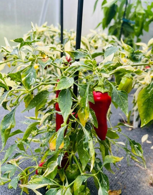 Eine für den Anbau im Kübel perfekte Pflanze. Sie trägt sehr gut und produziert süße, saftige Paprika, die von bunt gestreift nach rot abreifen. Die Wuchshöhe liegt bei ca. 40 cm.