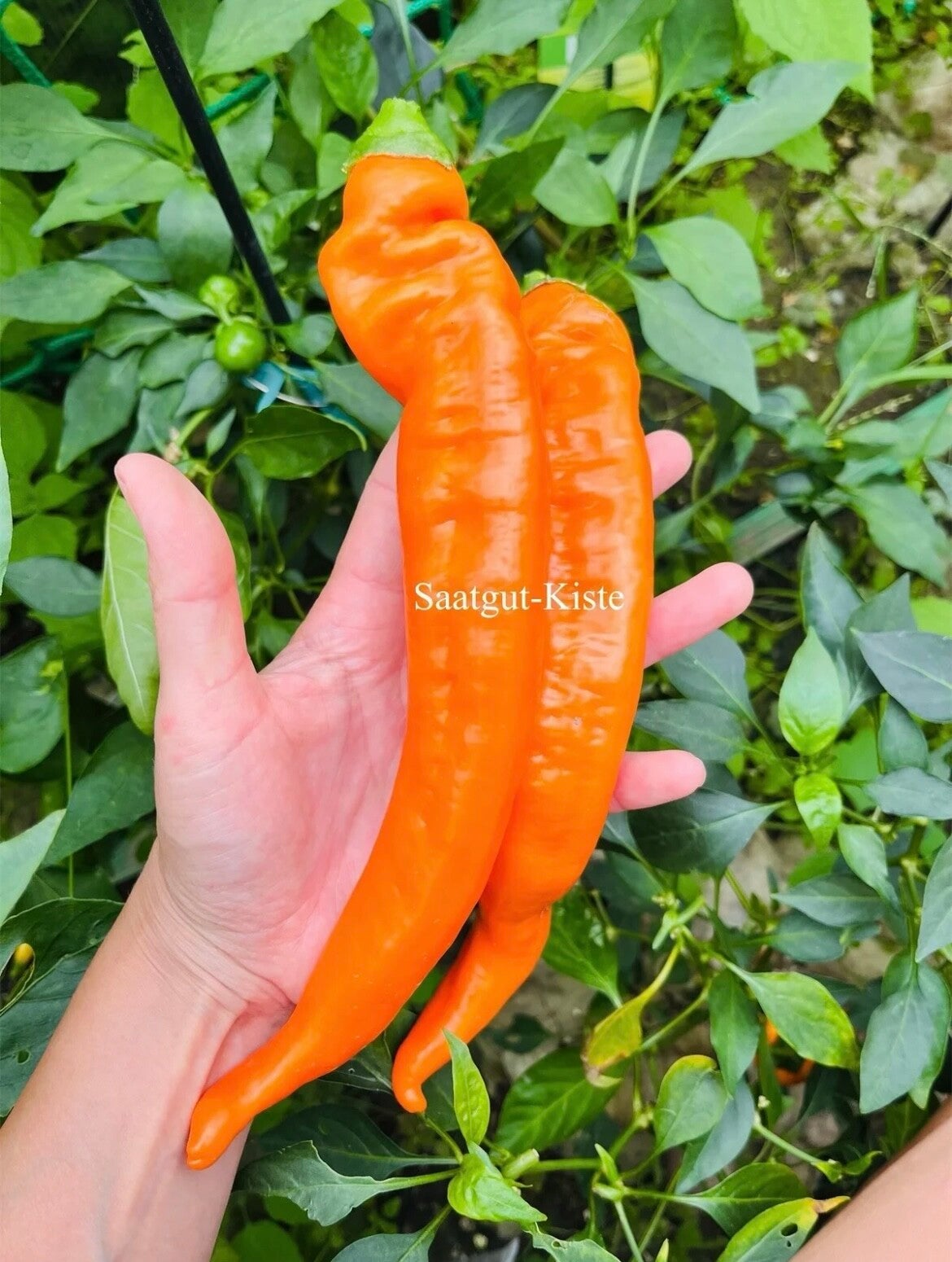 Kyrah kann eine Wuchshöhe von bis zu 1,20 Meter erreichen. Die Spitzpaprika reifen hellorange ab und haben einen süßlichen Geschmack. Die Schoten können eine Länge von 20-30 cm erreichen und sind nach der Ernte sehr lange haltbar. An einem sonnigen und geschützten Standort kann diese Sorte auch im Freiland angebaut werden. Diese Sorte kann auch im Freiland angebaut werden.