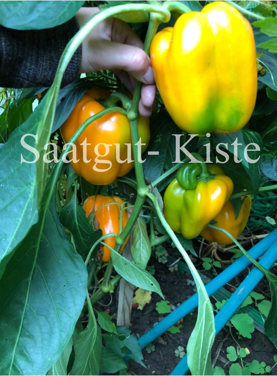 Rewia ist eine Sorte, die auch für den Anbau im Freiland geeignet ist. Sie trägt sehr gut, hat einen kompakten Wuchs und benötigt eine Stütze. Die orangefarbenen Früchte werden ca. 150 g schwer, sind dickwandig, länglich-blockig und verfärben sich von Dunkelgrün auf kräftig Orange.