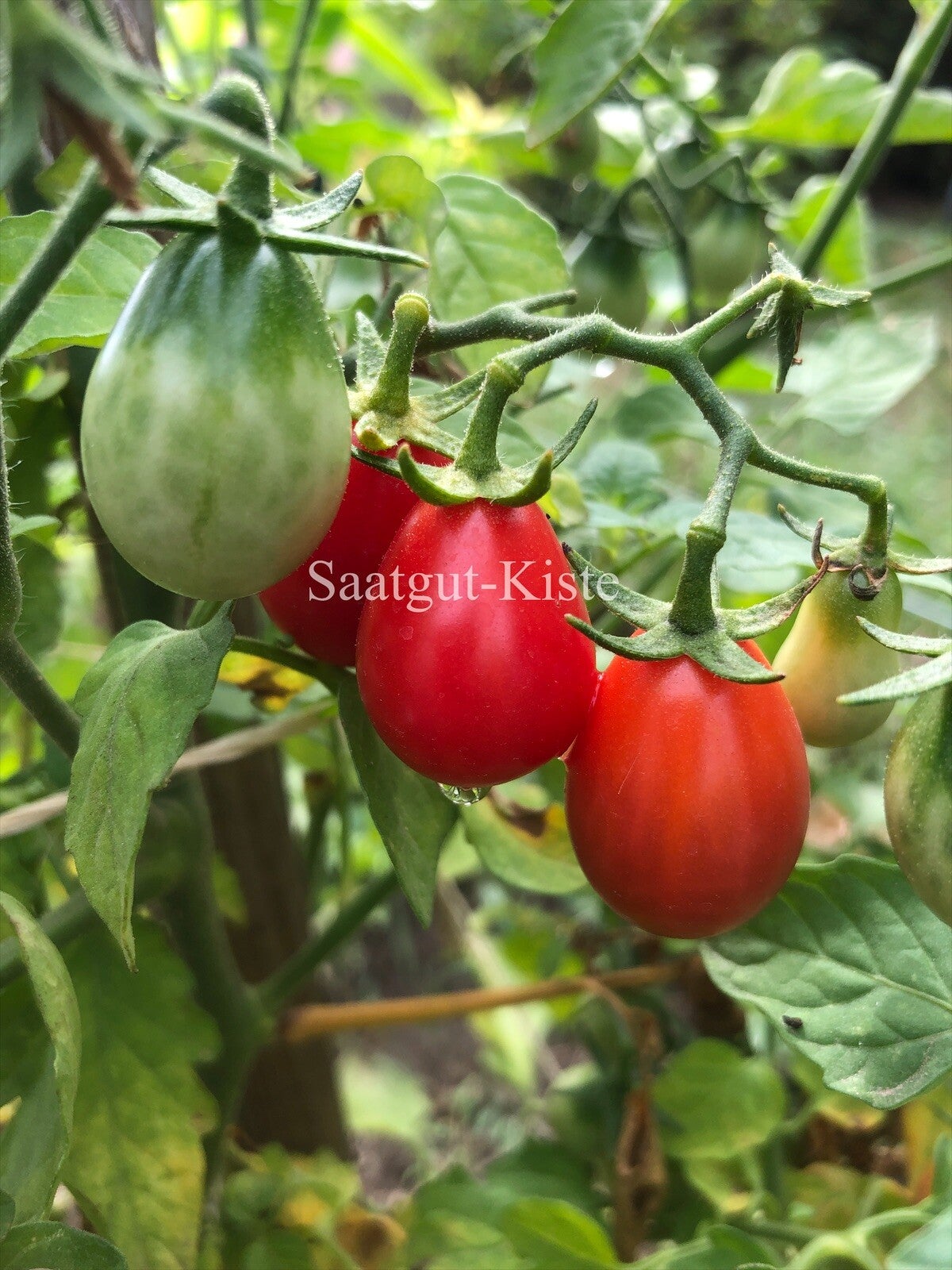 Die Sorte ist frühreif und sehr reichtragend. Die birnenförmigen Tomaten besitzen saftiges Fruchtfleisch, welches sehr aromatisch und ausgewogen ist. Die Wuchshöhe beträgt ca. 1,80 Meter.