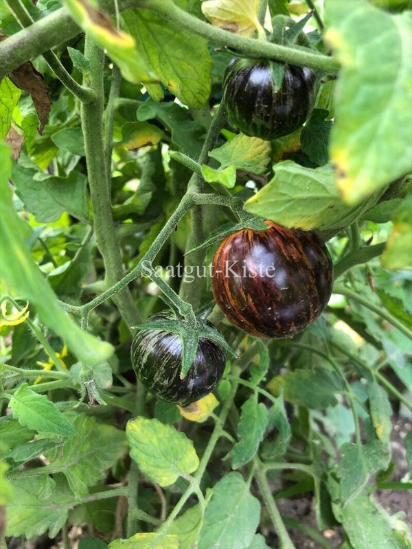 Diese wunderschöne und sehr ertragreiche Sorte erreicht eine Wuchshöhe von ca. 1,60 Meter. Die Früchte haben einen angenehmen süßen Tomatengeschmack. Diese Sorte sollte nicht ausgegeizt werden.