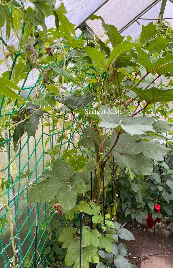 Okra ist eine der ältesten Gemüsearten und gehört zu den Malvengewächsen. Sie wächst aufrecht mit großen Blättern, schönen, bis zu 8 cm großen, gelben Blüten mit tiefrotem Kelchschlund und bis zu 30 cm langen, schlanken, burgunderfarbenen, essbaren Schoten.